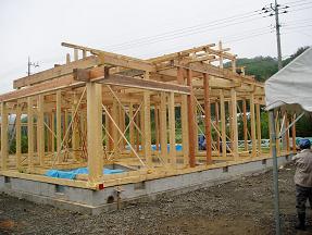 建て方匠らによって加工された柱 梁を一本一本組み込んでいきます